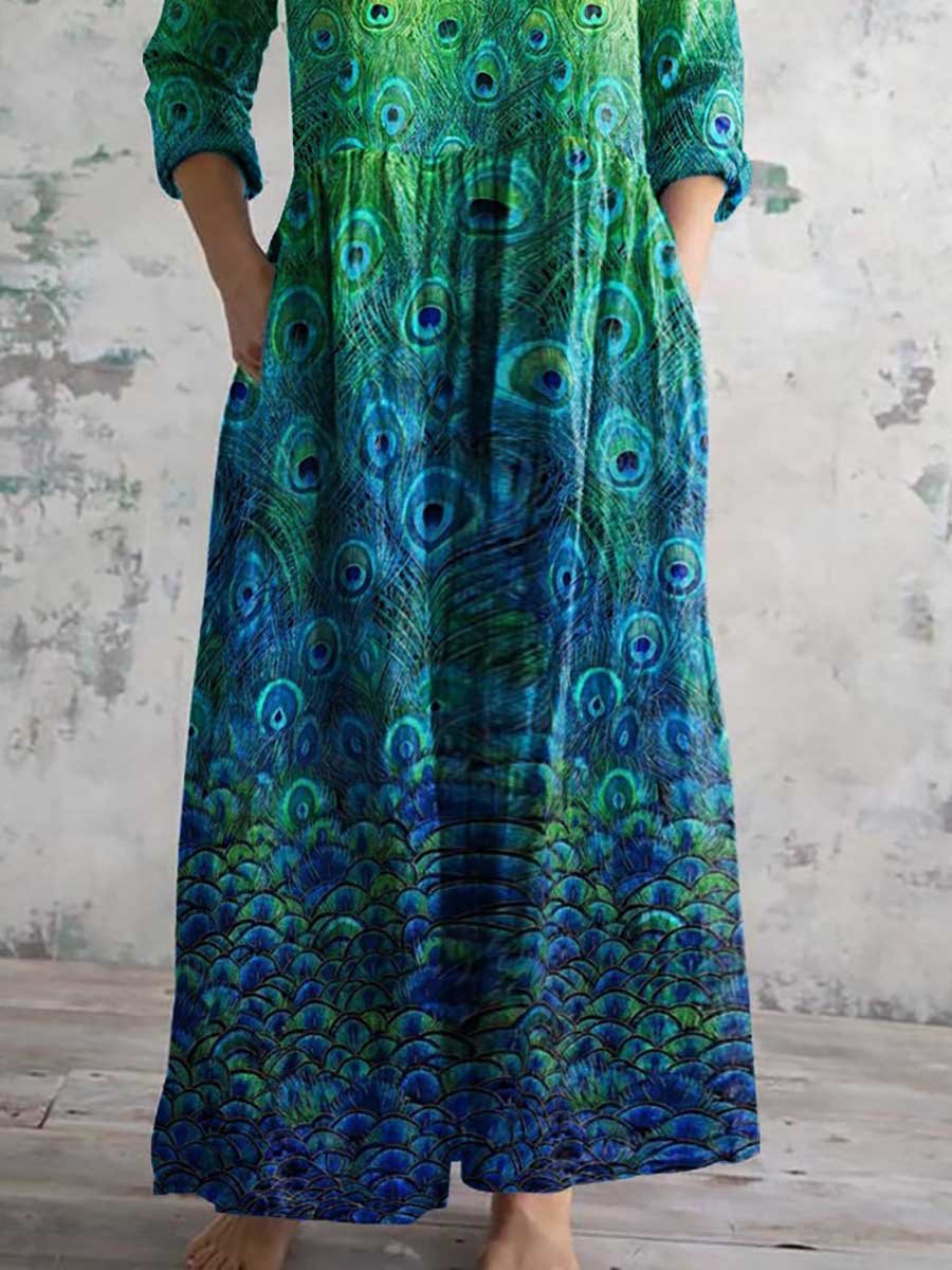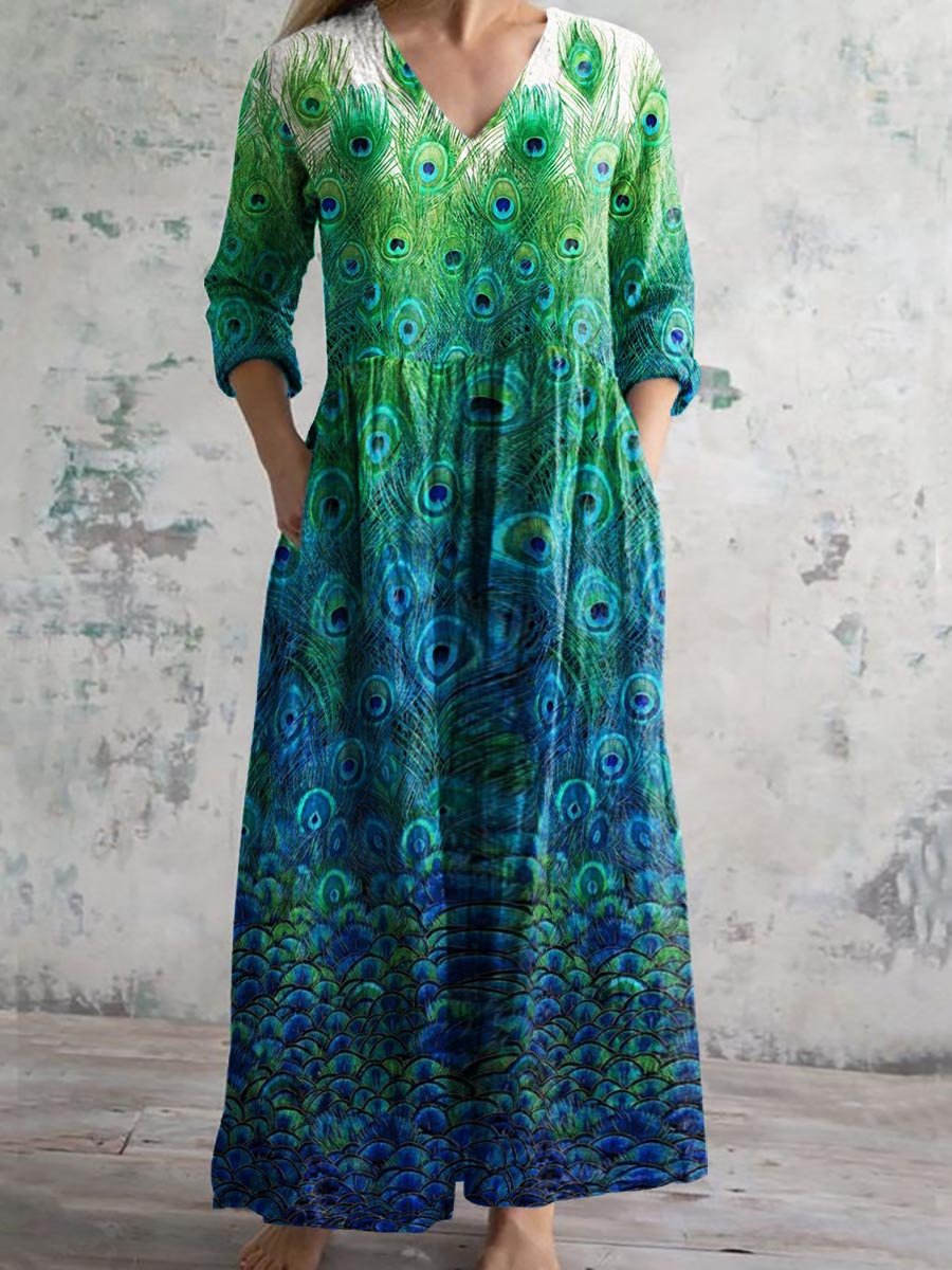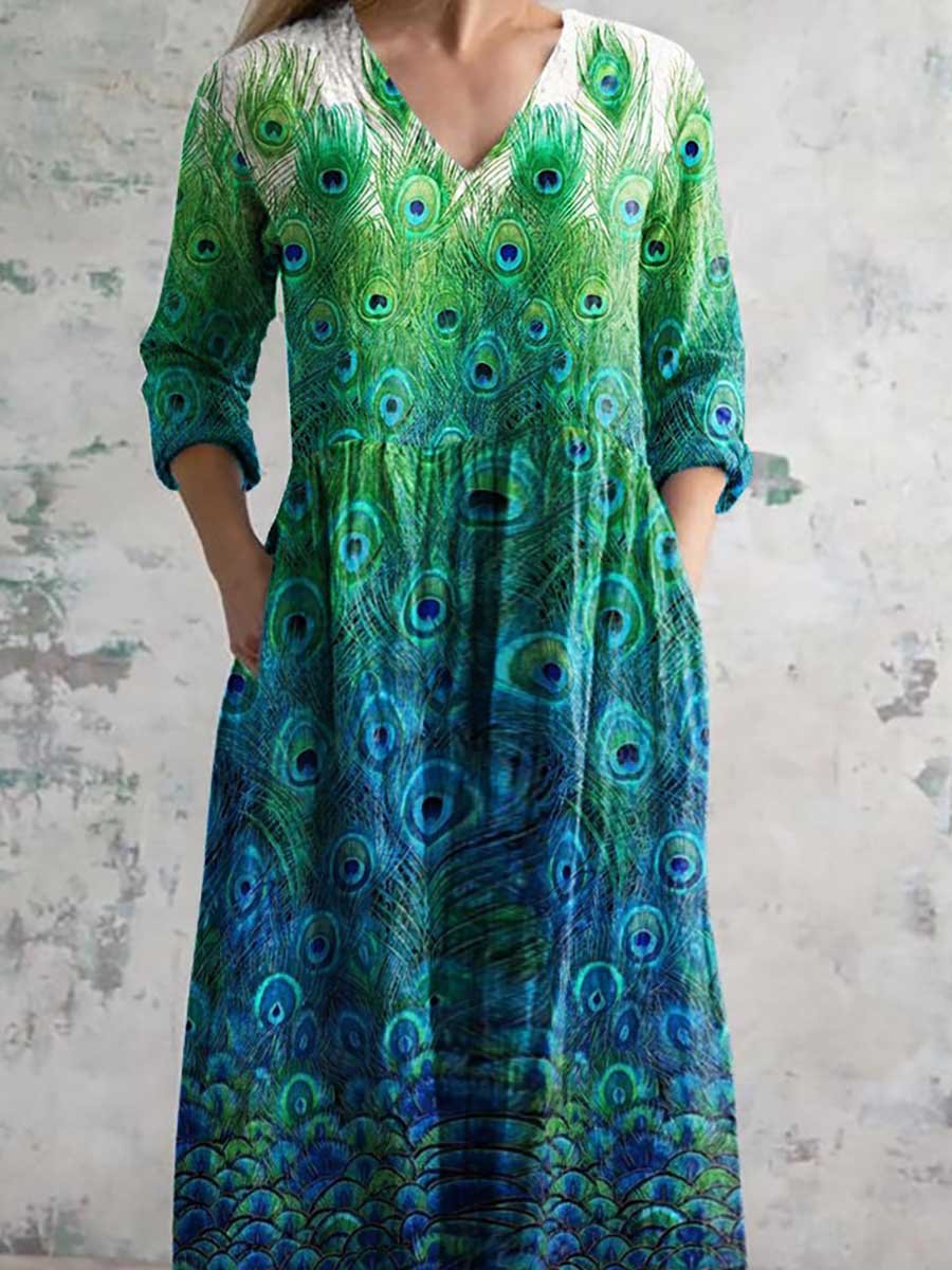 Women's V-Neck Colorful Peacock Pattern Cotton and Linen Pocket Dress