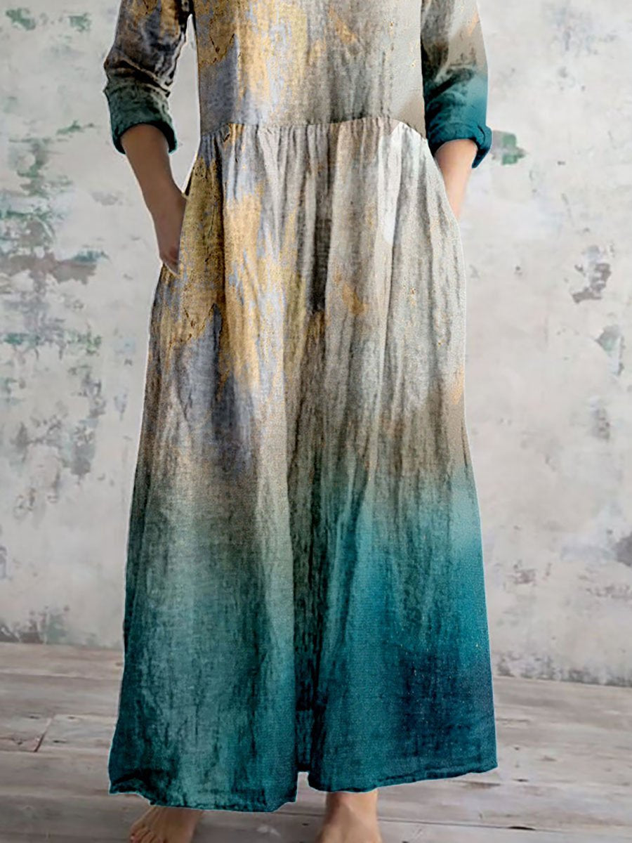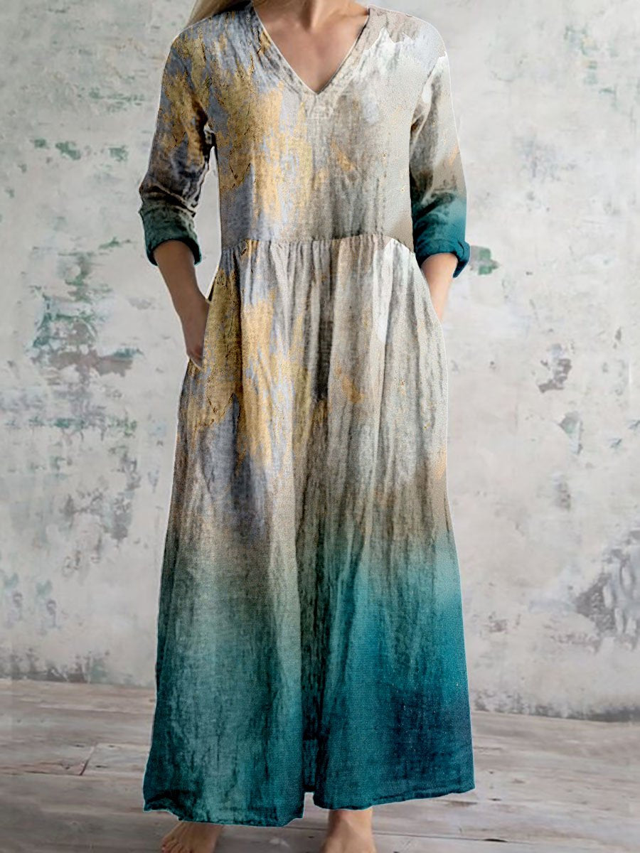 Women's V-Neck Watercolor Print Graphic Dress with Pockets