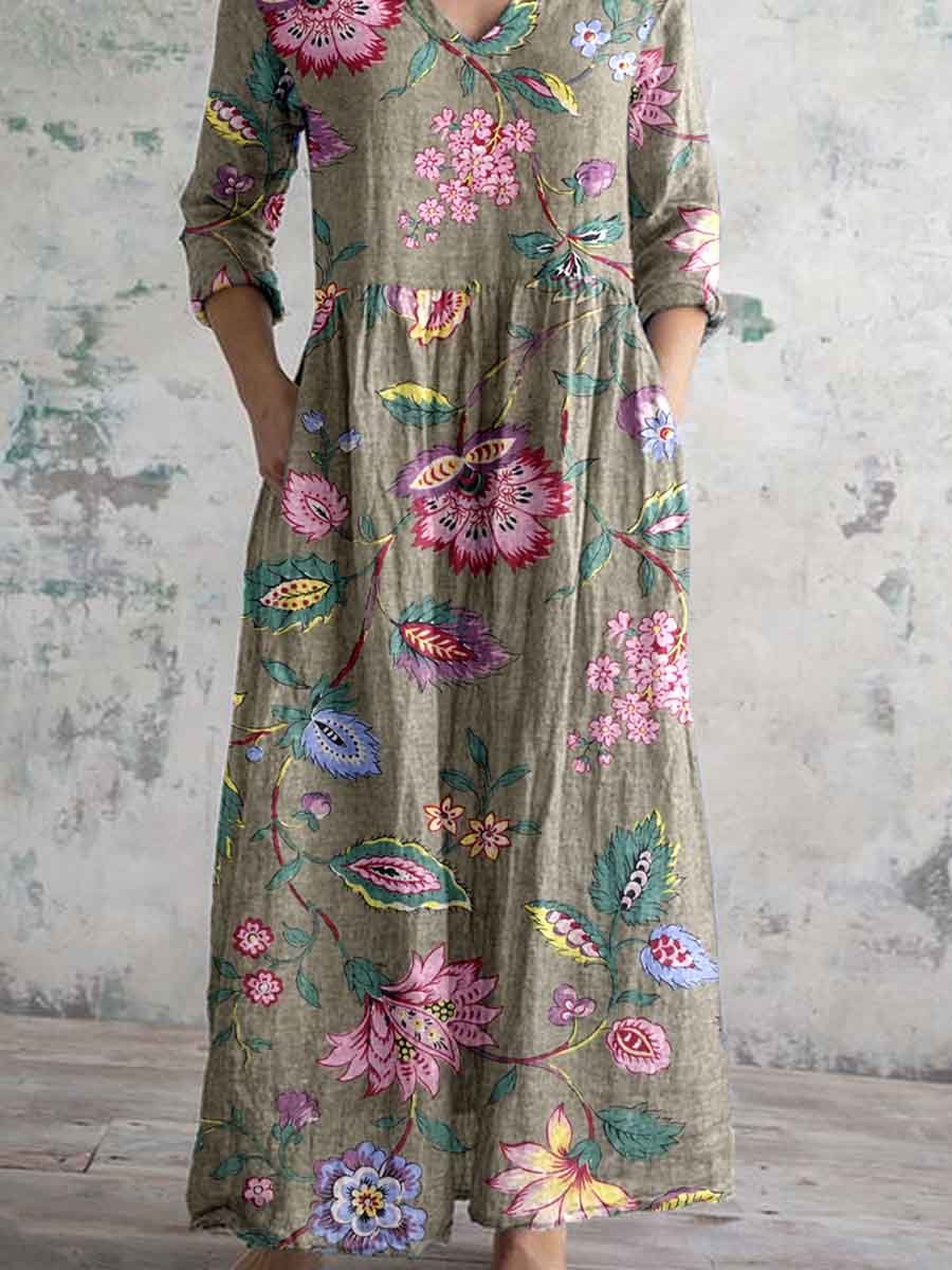 Women's Vintage Elegant Floral Pattern Cotton and Linen Dress with Pockets