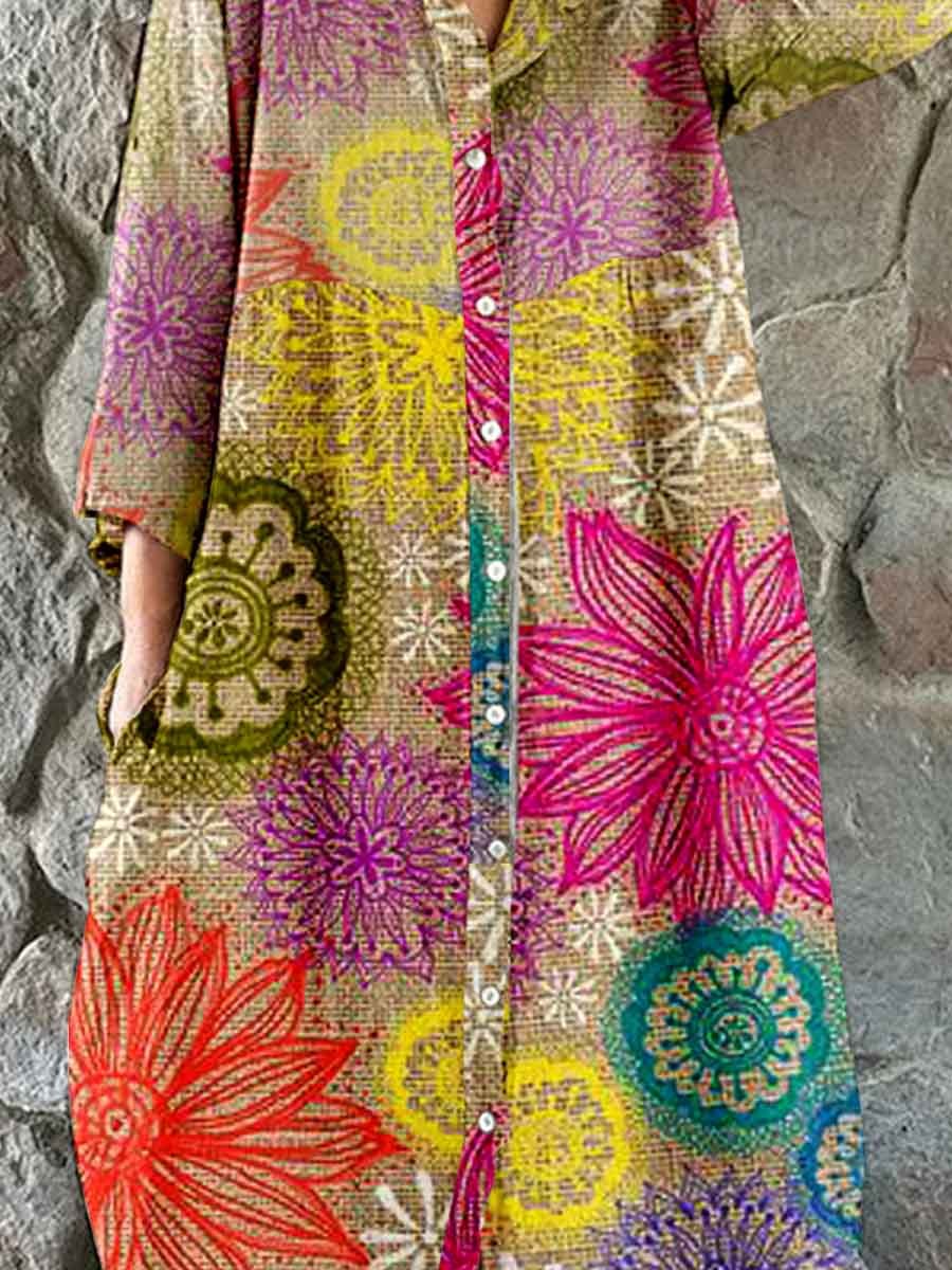 Women's Vintage Floral Pattern Shirt Style Cotton and Linen Dress