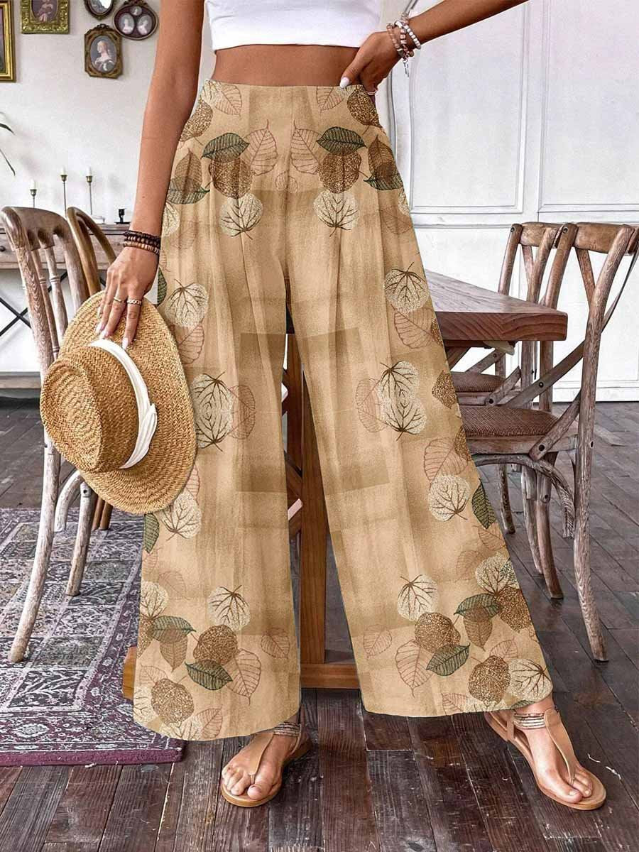 Women's Vintage Leaf Print Pattern Cotton Wide Leg Pants